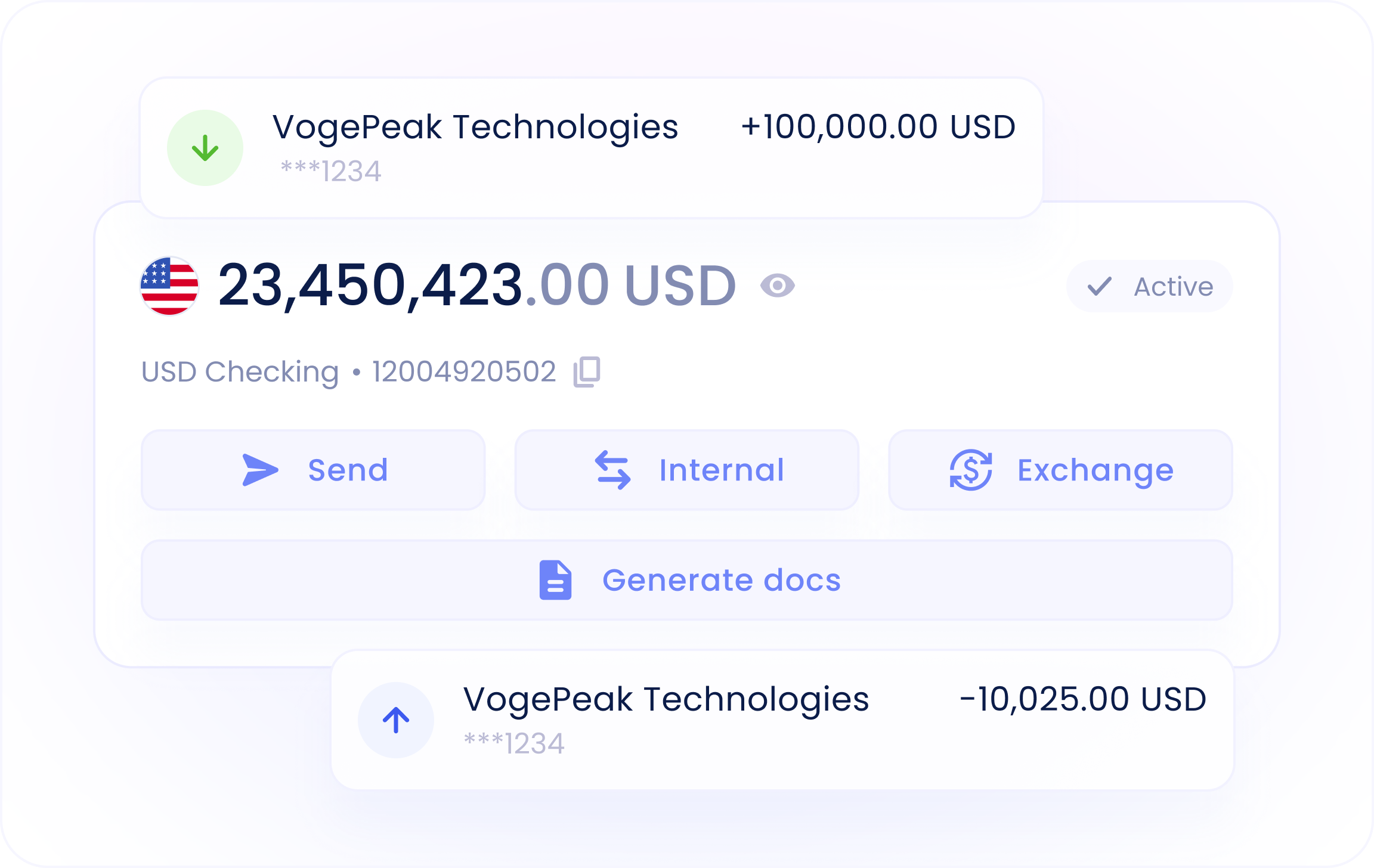 Every client starts with a USD account designed for operational efficiency, treasury management, and cross-border activity. Multi-currency capabilities can be added as your business expands internationally.