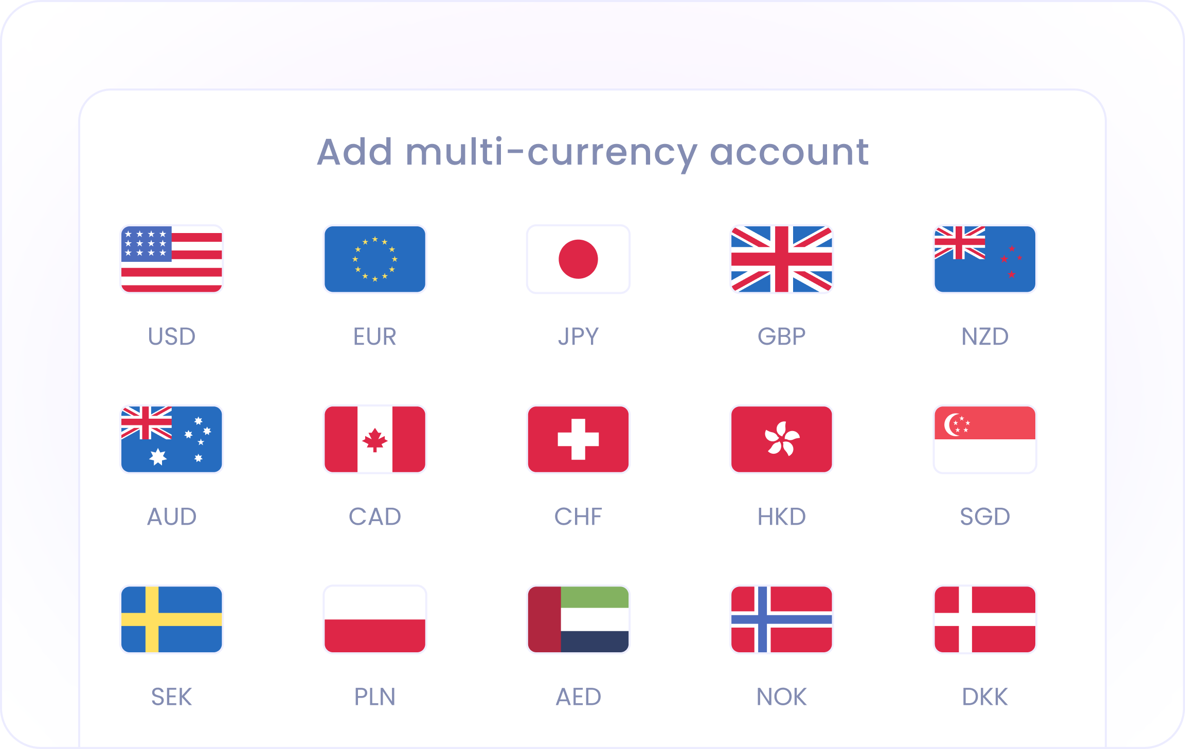 For eligible clients, multi-currency accounts can be added alongside your USD account with no additional opening fees. Hold and manage balances in 13+ supported currencies.