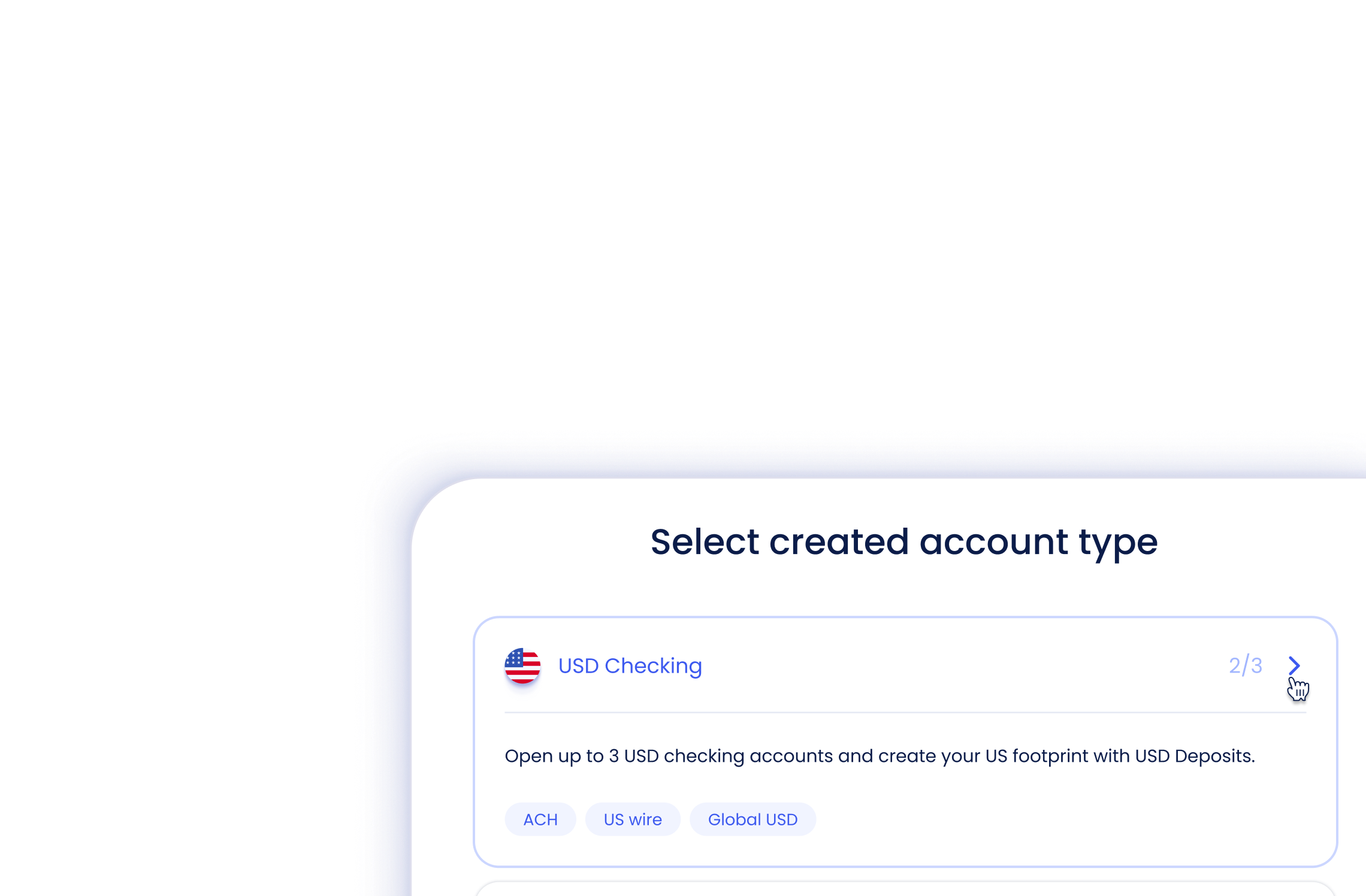 Access the American market with ease. Open and manage USD accounts remotely — no physical presence or local entity required.