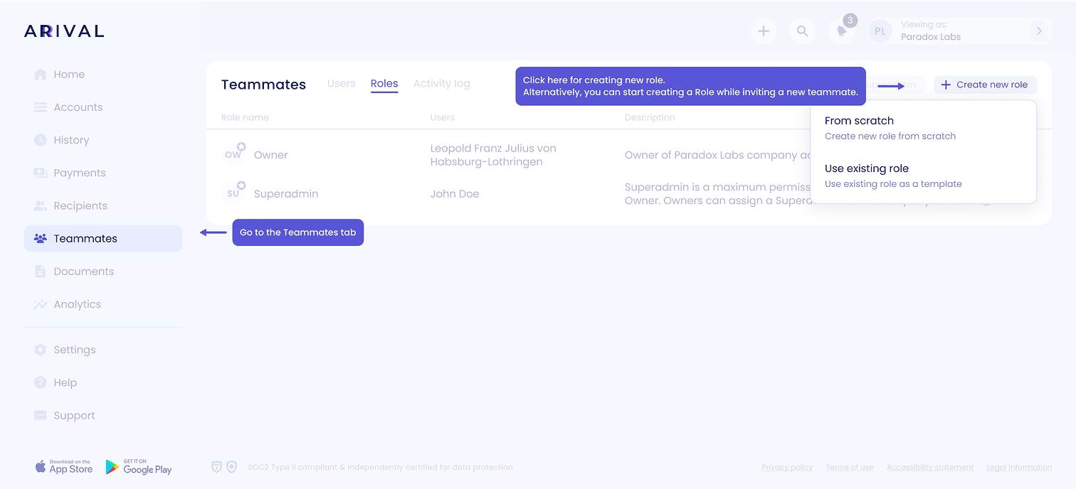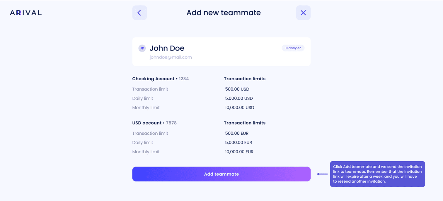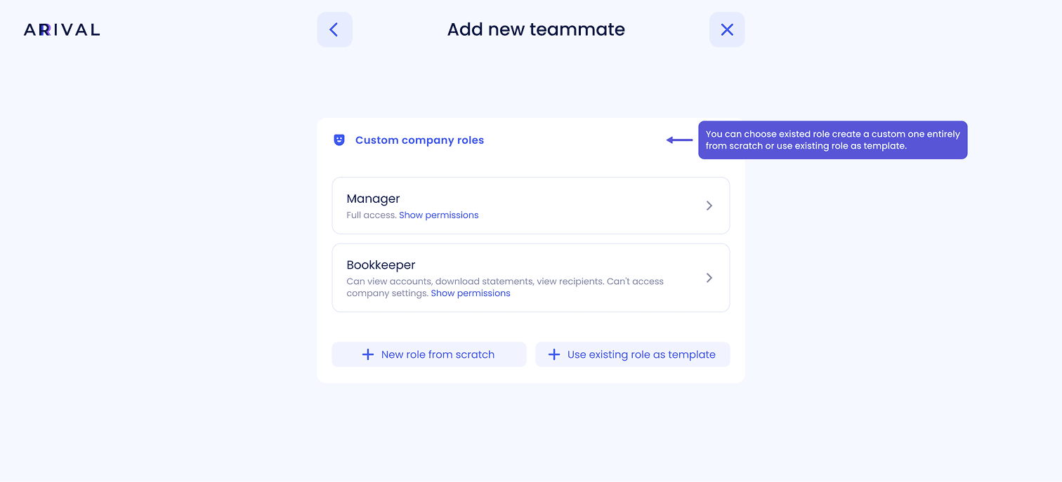 Arival's mission is to empower business globally, and we’ve made an entire toolbox for the true team players! Invite teammates, tailor and grant permissions, and set up your finance squad inside your Dashboard.