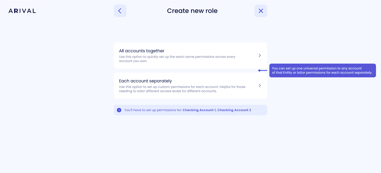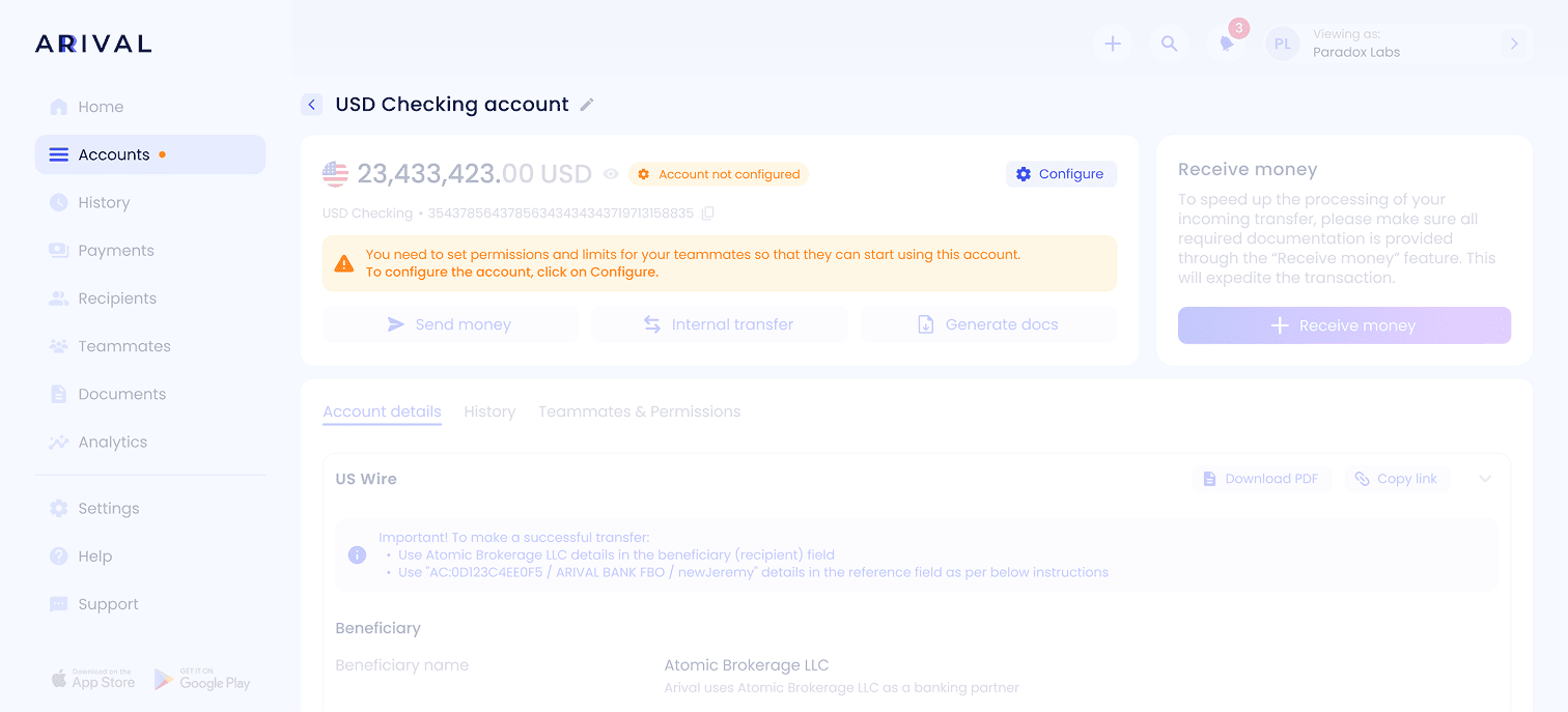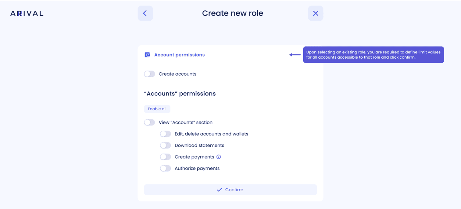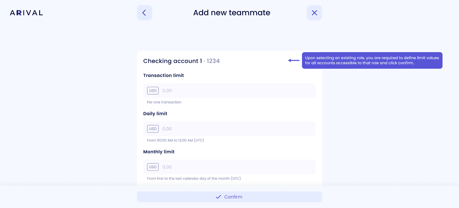 After the new account is created, it is marked as “Account not configured.”. Go to the Accounts tab, select the new account and click “configure”. It will open the flow, in which you’ll be asked to set up permissions and limits for the entire team to use this newly created account. Only after the account is configured will your team be able to use the new account, which will also appear in the Roles tab as you set permissions up.