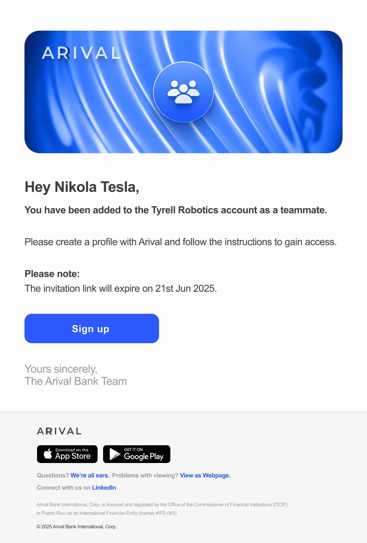 The invitation link is sent to the user's email box. Email invite will only come from no-reply@arival.com.