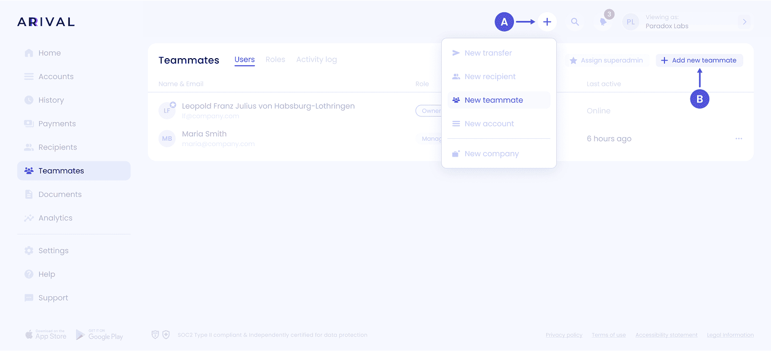 a. Сlick “Teammates” and then “+ Add new teammate” button